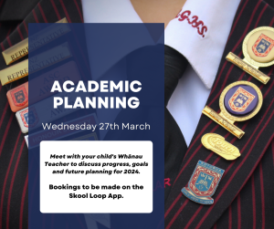 π Join us on Wednesday, March 27th for our first Academic Planning for 2024! π Meet with your child's WhΔnau Teacher to discuss progress, goals, and future planning for the year ahead.
