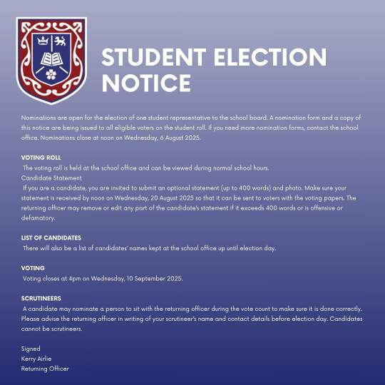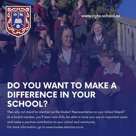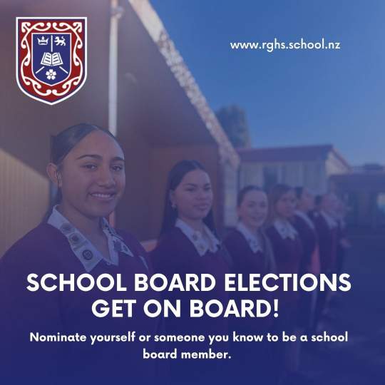 For more information or to request a nomination pack, please contact Kerry Airlie, Returning Officer, at kairlie@rghs.school.nz. Nominations for the Board open on 18 July 2025.