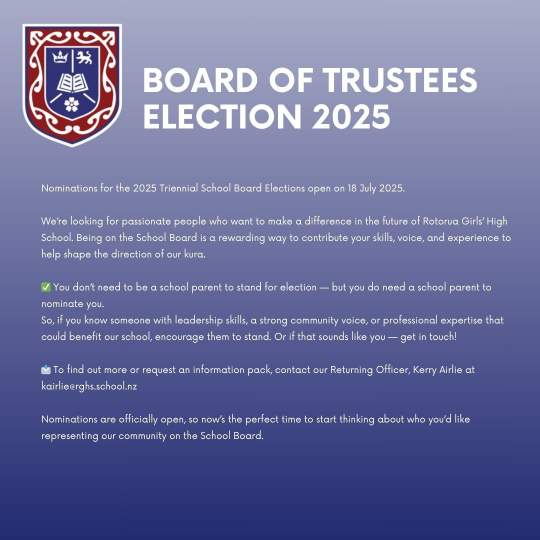 We are calling for nominations for both our 2025 Triennial School Board Elections and the Student Representative Election. These are exciting opportunities for members of our community and our student body to get involved in shaping the future direction of Rotorua Girls’ High School.
